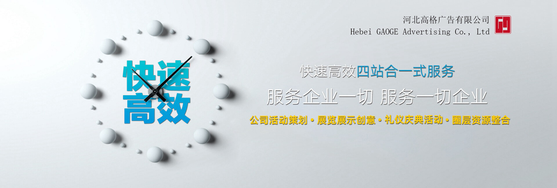 河北高格廣告有限公司是一家專業(yè)致力于大型文化活動組織策劃、展覽展示工程策劃、展臺設(shè)計制作、特裝展臺搭建、會議會場布置、巡回展覽、路演、公關(guān)推廣執(zhí)行、會議慶典禮儀、路演設(shè)備租賃、倉儲等一站式的專業(yè)服務(wù)公司。本公司憑借創(chuàng)新領(lǐng)先的服務(wù)理念,大型的廠房空間,現(xiàn)代化的機械設(shè)備,高素質(zhì)專業(yè)的服務(wù)團(tuán)隊,及在該行業(yè)多年的實戰(zhàn)經(jīng)驗,為地產(chǎn)營銷提供了優(yōu)秀的活動方案、為不同行業(yè)的數(shù)千家企業(yè)提供了專業(yè)個性化的空間展示方案,幫助客戶實現(xiàn)了自我品牌的提升和企業(yè)利潤的雙贏。...